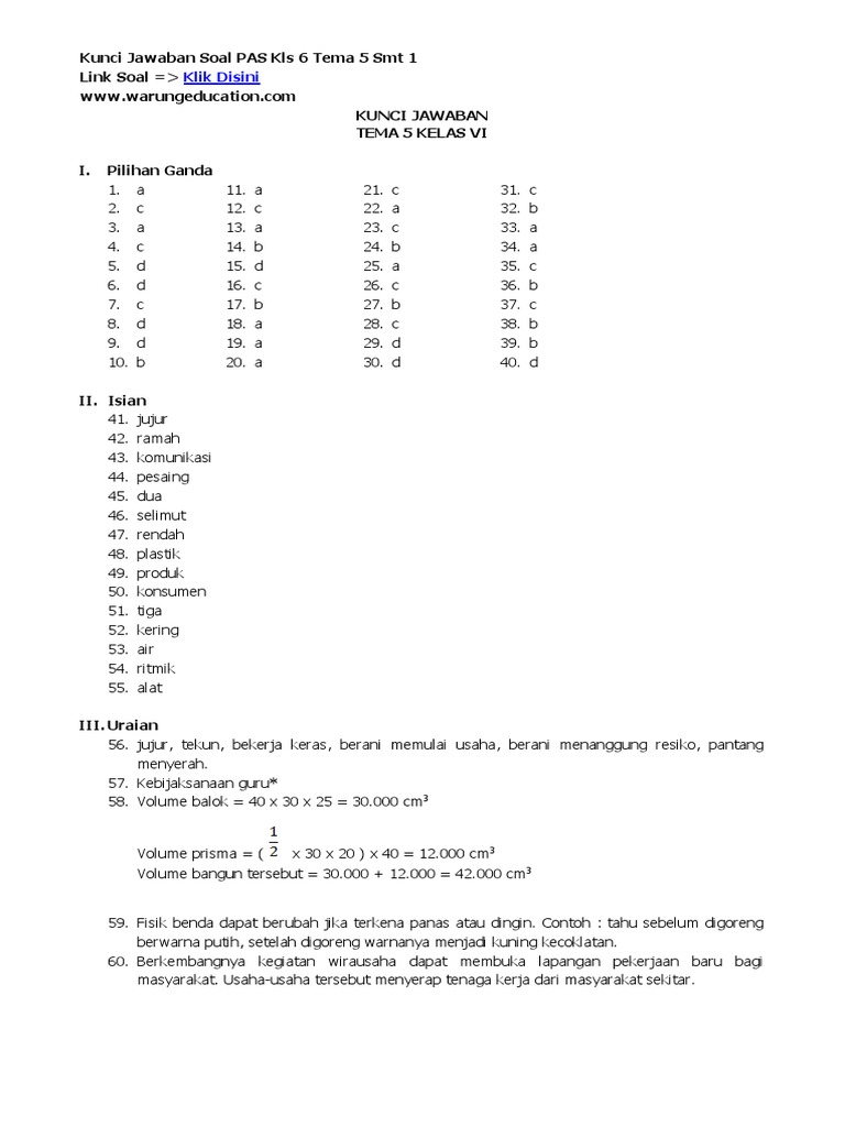 Kunci Jawaban Soal Pas Uas Kelas 6 Tema 5 Semester 1 Ganjil
