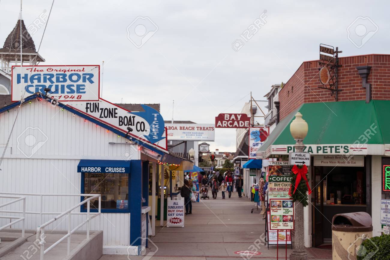 Shops Along Boardwalk Near Newport Beach At Balboa Island Stock